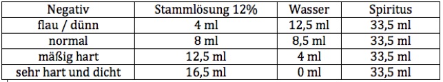 Wenn man anstatt des alkohol-löslichen Amoniumdichromat das alkohol-unlösliche Kaliumdichromat verwendet muss anstatt dem Spiritus Wasser verwendet werden. Da Amoniumdichromatlösungen durch Alkohol allmählich zersetzt werden, sollten diese Lösungen erst kurz vor Gebrauch angesetzt werden. Die Stammlösungen sind in einer lichtdichten Flasche ewig haltbar.